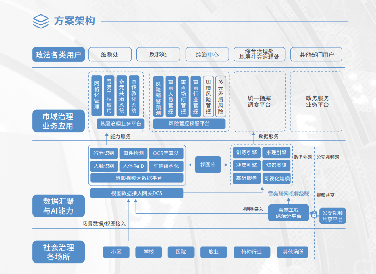 圍繞推進市域社會治理體制現代化為基礎,以防范化解各類風險、發揮引領保障作用、實現自治強基智治支撐為業務目標,依托城市政法政務體系,匯聚接入各委辦局及各類社會面資源,構造市域治理全量數據中心,并基于大數據、云計算、人工智能等方面的先進技術,建設業務應用平臺,打造開放、集成、共享、智能的“市域治理”解決方案。