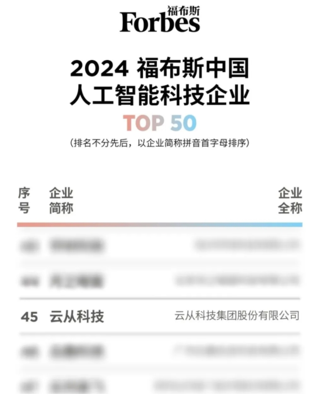 4月28日,福布斯中國(guó)正式推出了“2024福布斯中國(guó)人工智能科技企業(yè)TOP 50”榜單。云從科技憑借在人工智能領(lǐng)域的卓越成就與深遠(yuǎn)影響力,榮膺殊榮,成功躋身榜單。