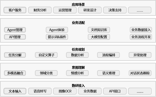 通過訪問企業各類業務數據、應用系統API、文檔庫等,實現以多模態交互方式,在大模型的協助下完成意圖理解、規劃、決策和執行,為客戶、員工、管理者提供覆蓋各類業務場景的智能應用。